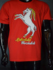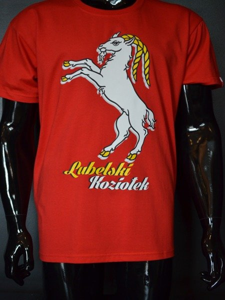 A red T-shirt with a motif depicting a Lublin goat, beneath a goat, a signature in gold and white, "Lubelski Koziolek".