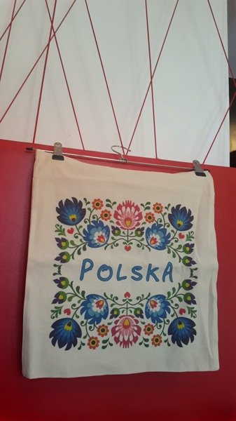 • Torba bawełniana - Motyw łowicki kwiaty ramka i napis Polska z krótkimi uszami.