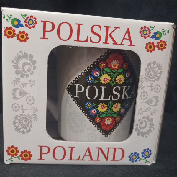 Kubek z napisem POLAND. Wszystko ładnie dopełniają efekty folklorystyczne.